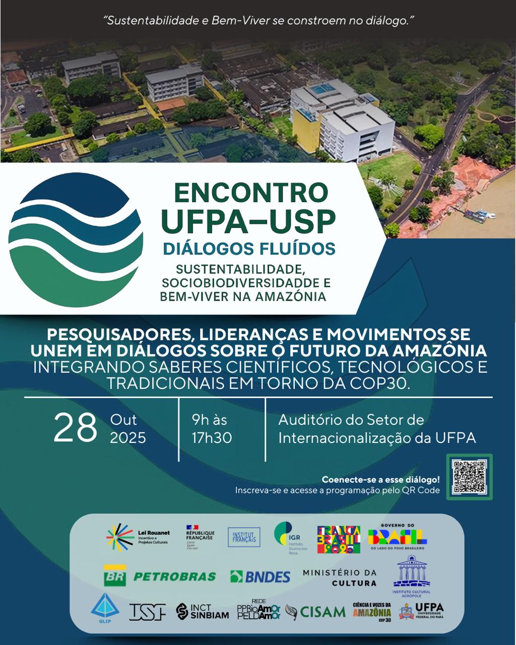A Universidade Federal do Pará (UFPA) sedia hoje, 28 de outubro, o evento “Encontro UFPA–USP: Diálogos Fluídos: Sustentabilidade, Sociobiodiversidade, arte e Bem-Viver na Amazônia”, uma iniciativa conjunta com o Global Institute for Peace (GLIP-USP) e a Escola Politécnica da Universidade de São Paulo (USP). O objetivo é fortalecer parcerias entre universidades, comunidades tradicionais e movimentos socioambientais em torno da sustentabilidade e da construção do bem-viver na Amazônia.
