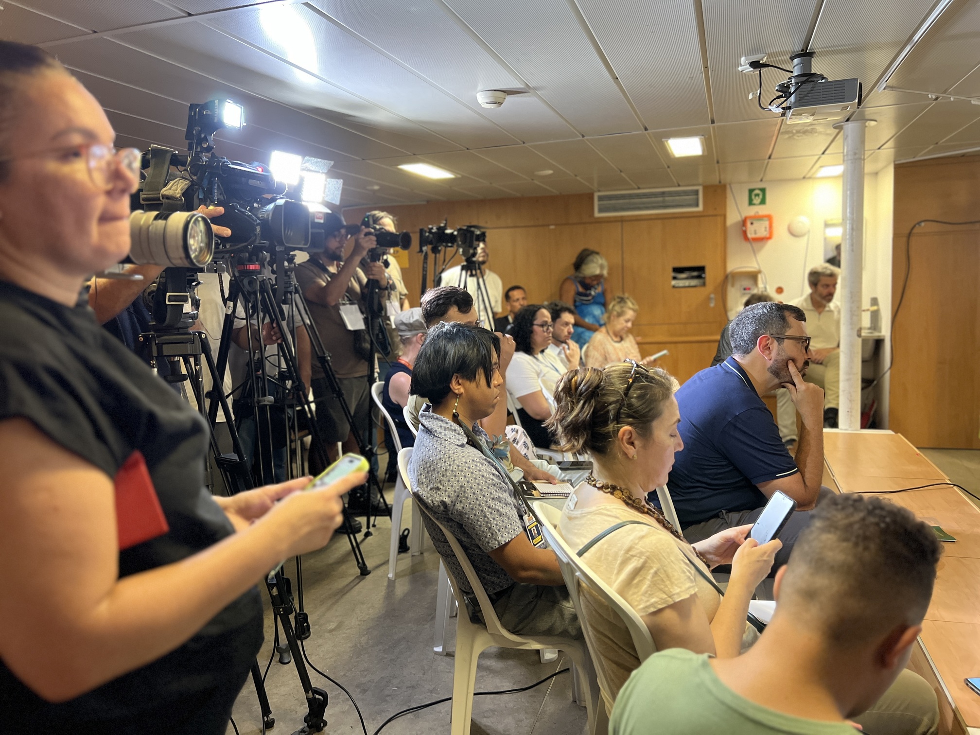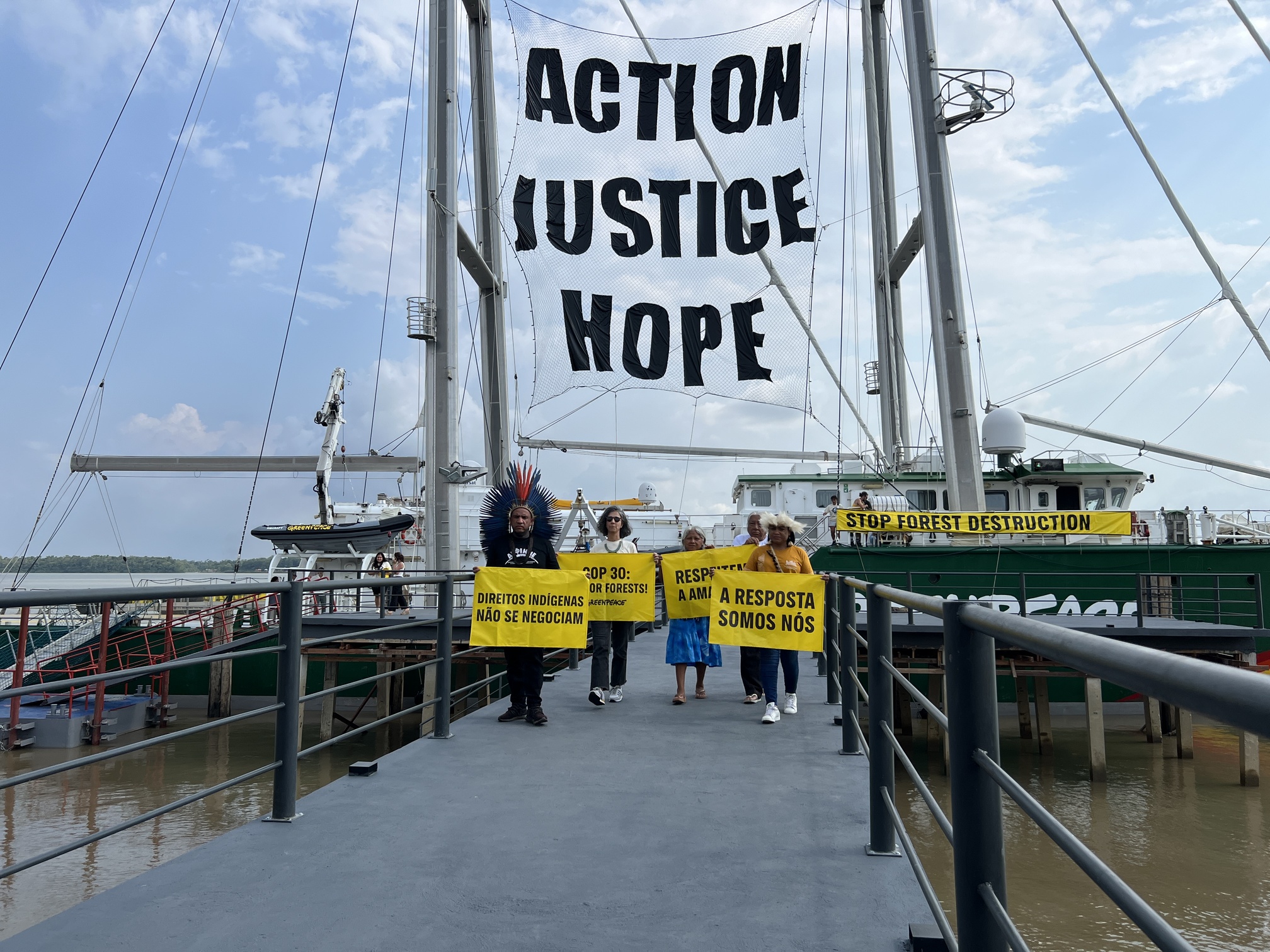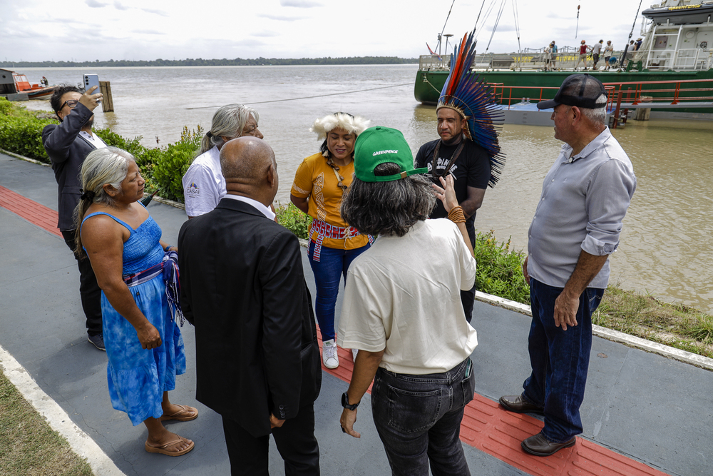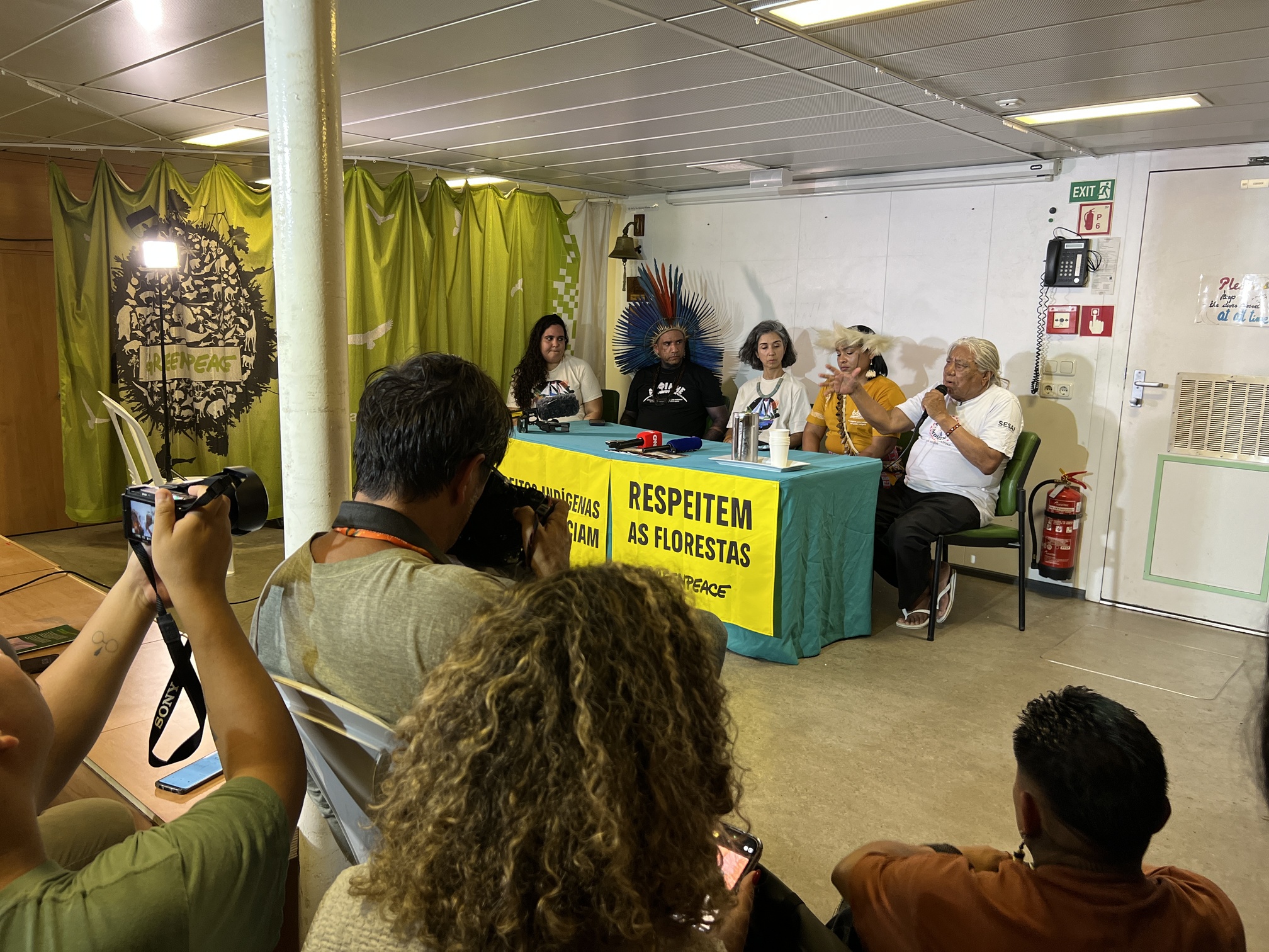 Coletiva- Por volta das 15h, representantes do Greenpeace e lideranças indígenas que chegaram juntos em Belém, receberam a imprensa para uma coletiva. Para a recepção dos jornalistas, logo na entrada da embarcação, eles trouxeram cartazes nas mãos com frases em português e inglês como “direitos indígenas não se negociam” e “respeitem a Amazônia”. A entrevista foi concedida por Carolina Pasquali, diretora executiva Greenpeace Brasil; cacique Kaiapó, Megaron Txucarramãe; Ângela Kaxuyana, representante da Coordenação das Organizações Indígenas da Amazônia Brasileira (COIAB); e Dinamam Tuxá, coordenador executivo da Articulação dos Povos Indígenas (APIB).