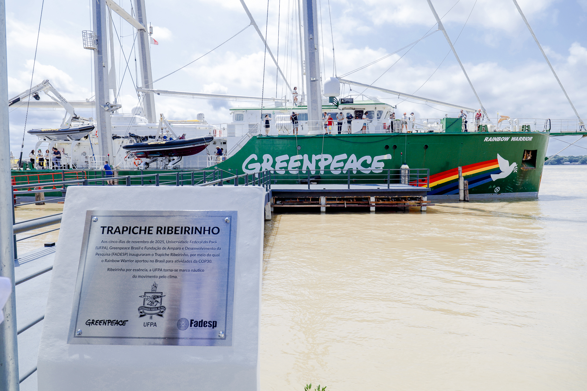 “Ação, Justiça e Esperança” e “Parem de destruir a Floresta”. Essas palavras, traduzidas do inglês, marcaram a chegada do navio Rainbow Warrior, do Greenpeace, na Universidade Federal do Pará, no final da manhã desta quarta-feira, 05 de novembro de 2025. O veleiro ancorou no trapiche Ribeirinho, inaugurado hoje, especialmente construído no Campus Guamá, da UFPA, em Belém, capital-sede da Conferência das Partes sobre Clima, a COP 30.