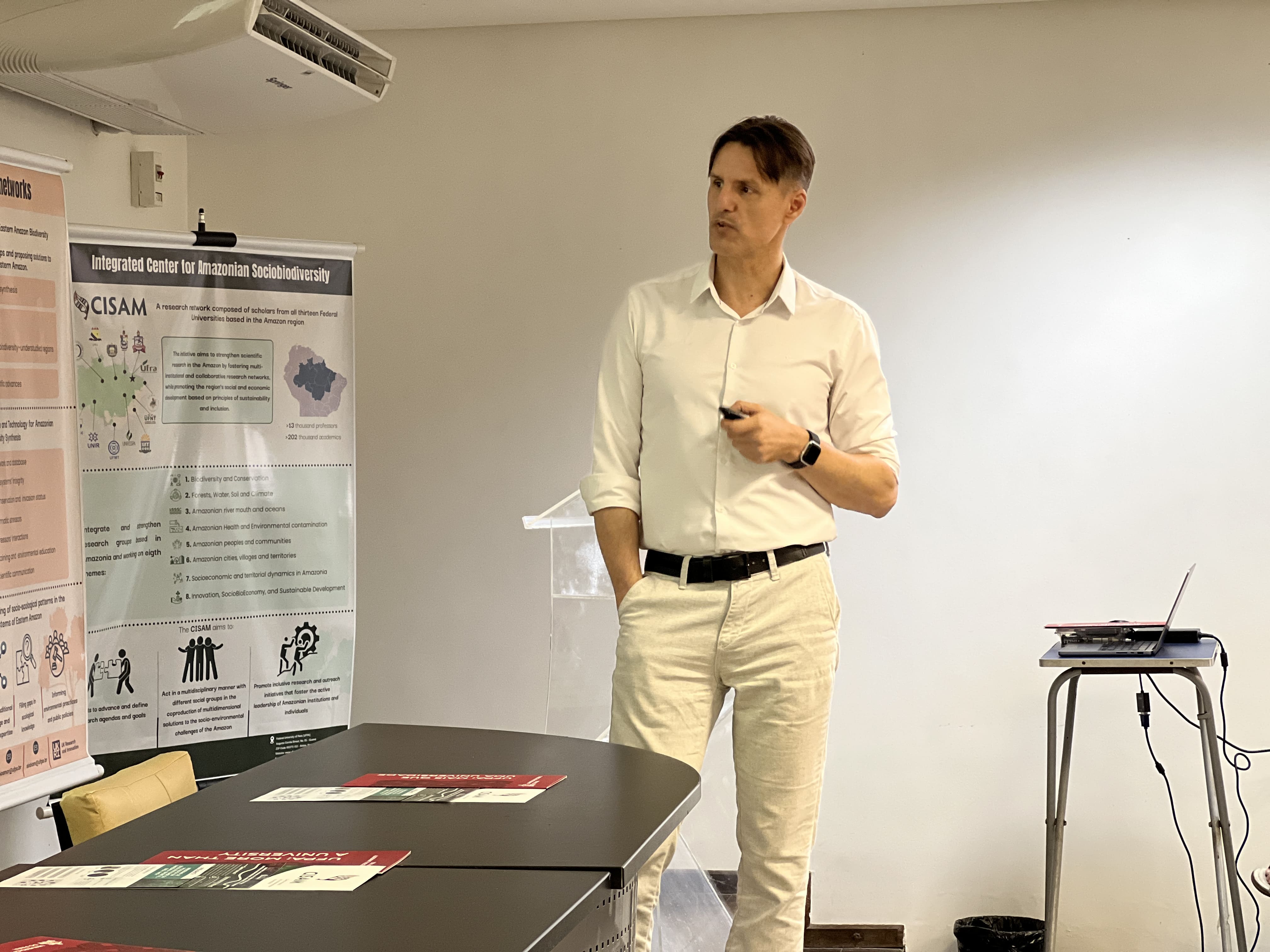 Na sequência, o professor Leandro Juen (UFPA) apresentou as redes colaborativas de pesquisa-ação coordenadas pela UFPA, como o INCT Sínteses da Biodiversidade Amazônica (SinBiAm), o Programa de Pesquisa em Biodiversidade da Amazônia Oriental (PPBio AmOr), o Centro Avançado de Pesquisa-Ação da Conservação e Recuperação Ecossistêmica da Amazônia (CAPACREAM) e o Centro Integrado da Sociobiodiversidade Amazônica (CISAM). “Essas redes mostram como a ciência amazônica está preparada para cooperar internacionalmente. Queremos fortalecer parcerias que unam pesquisa, formação e políticas públicas para o desenvolvimento sustentável da região”, destacou Juen.