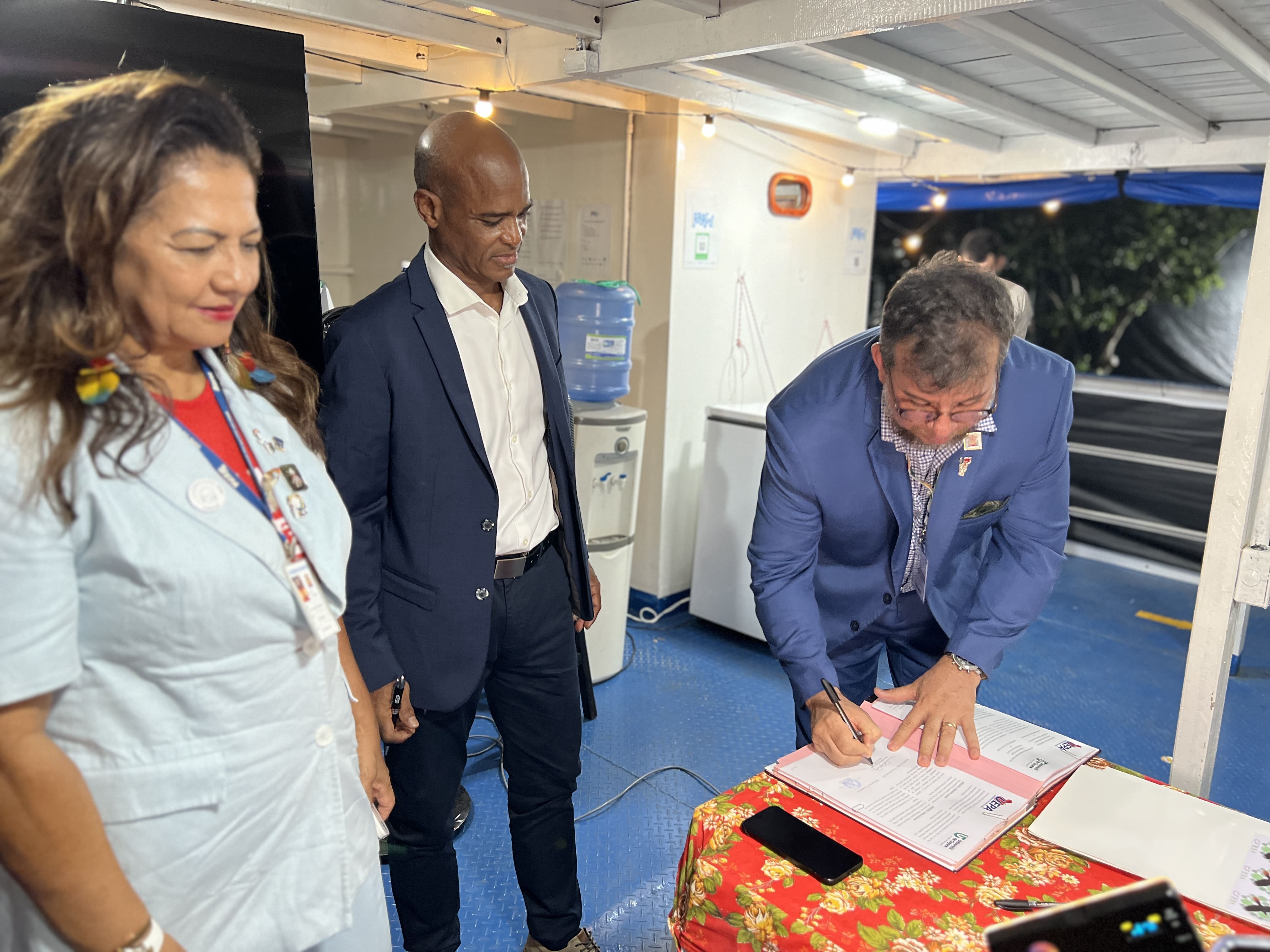 Participaram, a reitora da Universidade Federal do Amazonas (UFAM), Tanara Lauschner, a vice-reitora da Universidade Federal do Amapá (UNIFAP), Ana Cristina Maués, além dos reitores da Universidade Federal do Sul e Sudeste do Pará (UNIFESPA), Francisco Ribeiro da Costa; da Universidade Federal do Oeste do Pará (UFOPA), Aldenize Ruela Xavier; e o reitor da Universidade do Estado do Pará (UEPA), Clay Chagas; além do reitor da Universidade da Guiana Francesa, Laurent Linguet e do Embaixador da França no Brasil, Emmanuel Lenain. A equipe da Embaixada da França também foi representada pela conselheira científica, Sophie Jacquel, além da conselheira do Centro Franco Brasileiro de Biodiversidade, Nadège Mezie, e por Abdel Sifeddine, represente do IRD.