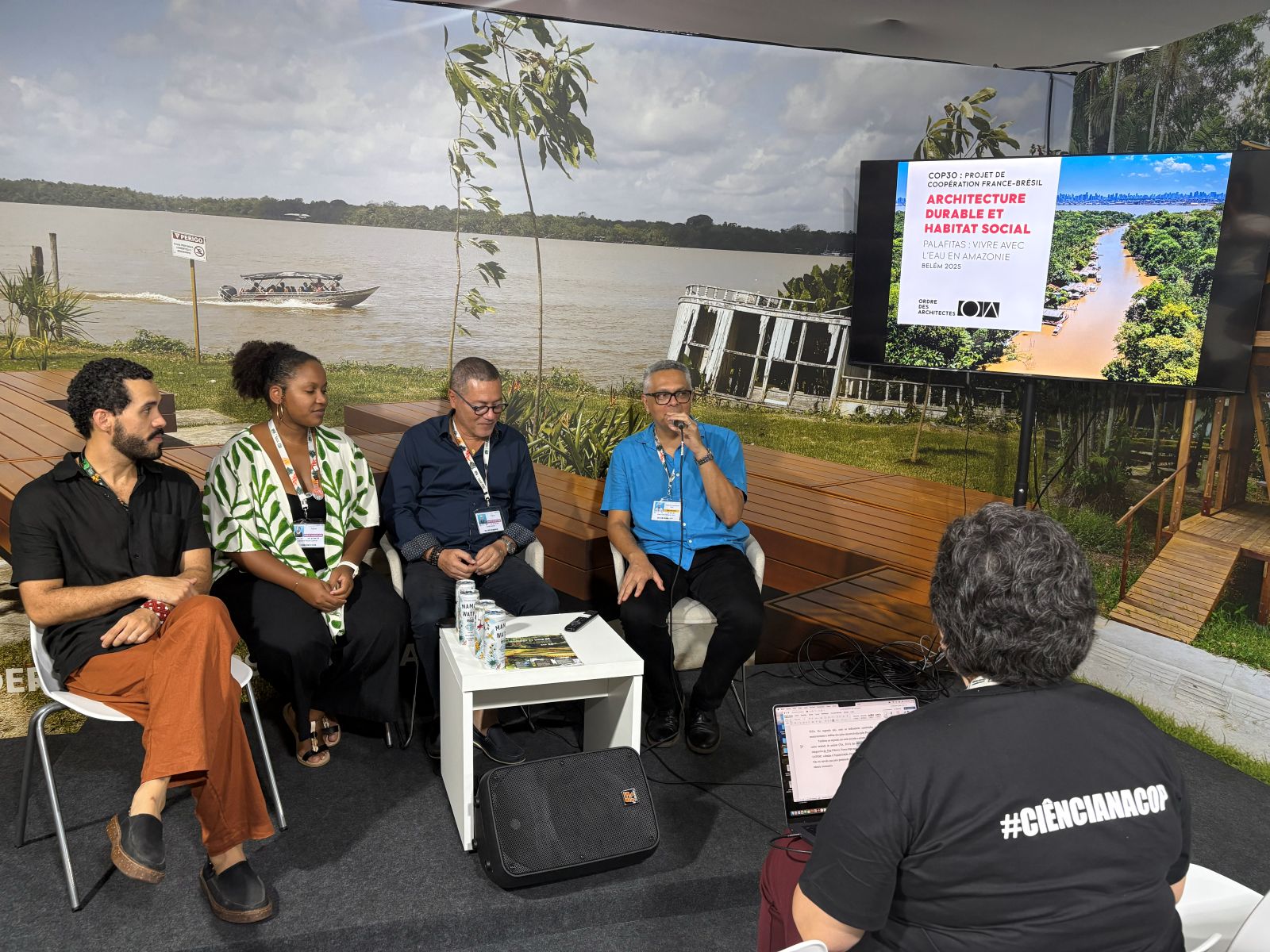 O painel seguinte trouxe o debate franco-brasileiro “Palafitas: viver com água na Amazônia / Palafitas: vivre avec l’eau en Amazonie”. A moderação foi de José Júlio Lima (UFPA), que conduziu os diálogos com André Barra (pres. Ordem dos Arquitetos da França – Guiana Francesa), Caroline Marie-Calixte (Ordem dos Arquitetos da França – Guiana Francesa) e Matheus Vieira (Laboratório da Cidade), explorando soluções arquitetônicas e sociais para a vida em territórios alagáveis.