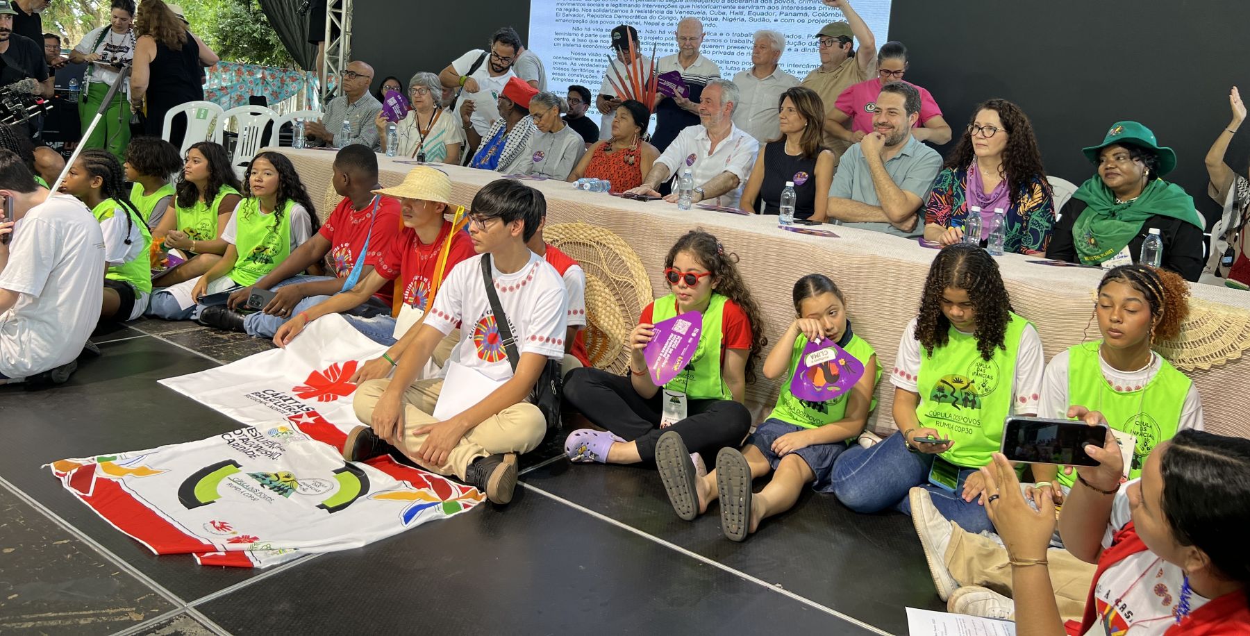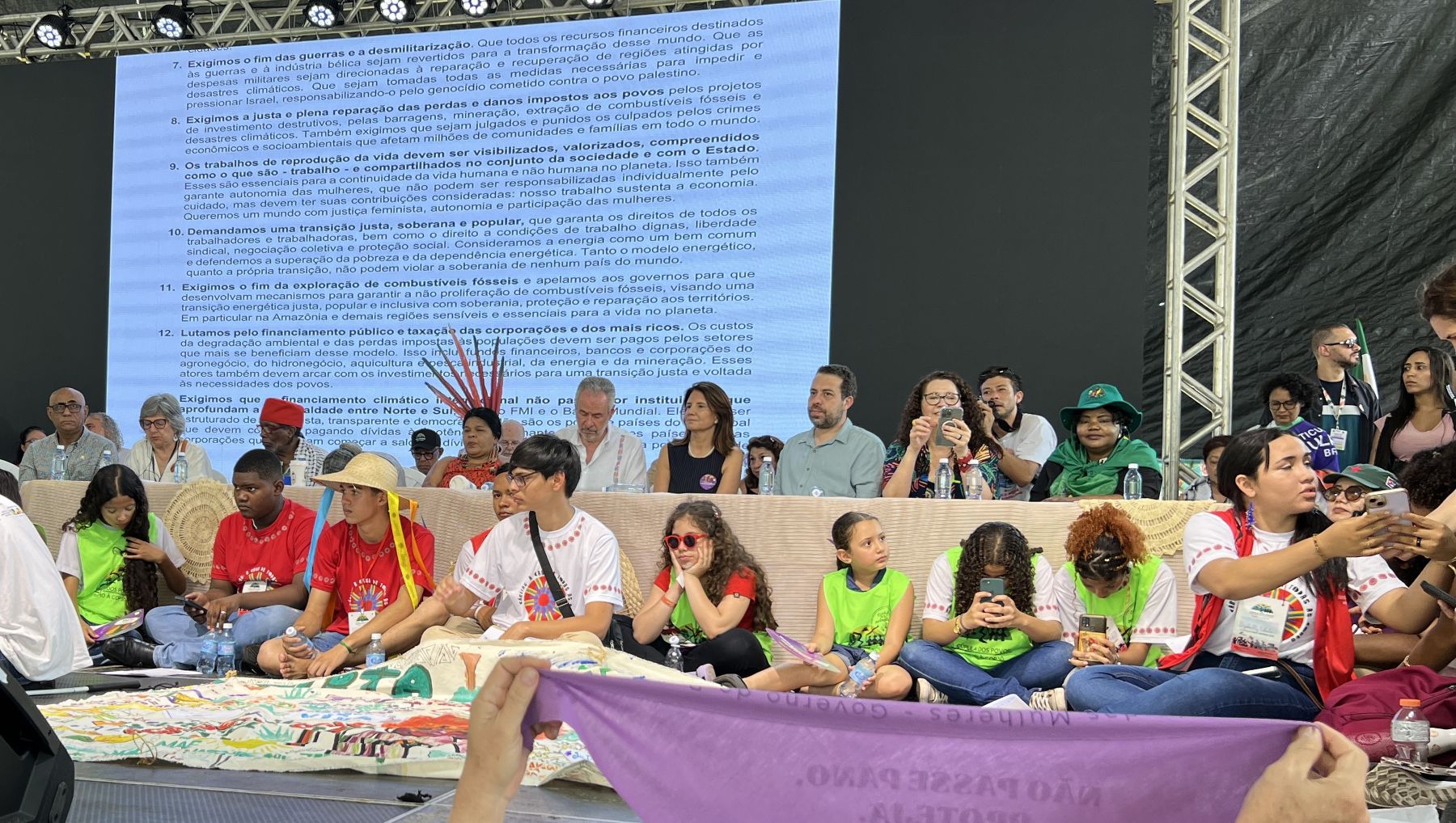 Na cerimônia, cerca de 30 adolescentes representaram 600 crianças e adolescentes de 0 a 17 anos, que durante cinco dias compartilharam dores, vivências e reivindicações sobre a crise climática em seus territórios, das ilhas às periferias, dos quilombos às terras indígenas.